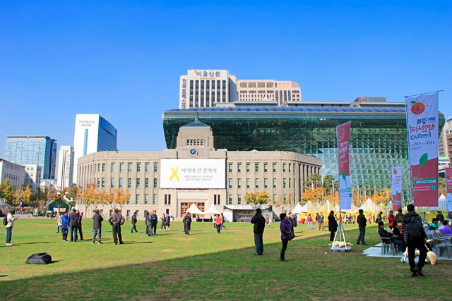 Vixe! Na hora de pagar pela oleosa panqueca, percebemos que nossas reservas de wones haviam se esgotado. O restante das cédulas que tínhamos trocado no aeroporto eram suficientes apenas para custear aquela rápida e barata refeição e uma passagem de metrô. No lado de fora do mercado, perguntamos a um jovem casal onde encontraríamos uma casa de câmbio por ali. Eles, num inglês um pouco escasso, mas de maneira bastante cortês (os coreanos são um doce!), disseram que em Dongdaewongbongchung%$#@*!! (entendi algo desse tipo) encontraríamos uma. Também disseram que poderíamos trocar nossas moedas nos bancos situados no entorno da City Hall (prefeitura). Com recursos para apenas uma passagem de ida, não dava para arriscar no lugar de nome estranho. Fomos à região da prefeitura, que fica a alguns quarteirões de onde começamos nosso roteiro daquele dia. Tivemos que voltar no percurso, portanto.