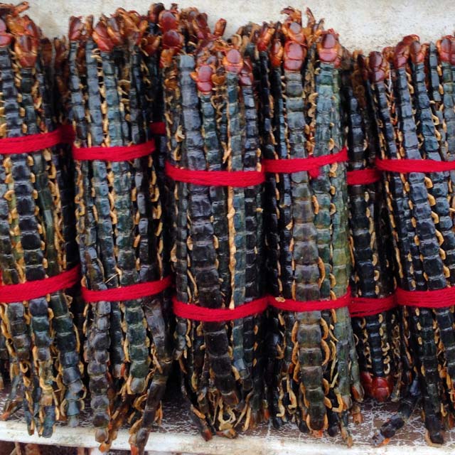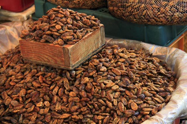 Ali, conhecemos o beondegi, iguaria coreana bastante popular. Trata-se da pupa do bicho-da-seda. Carne exótica, para mim, nem pensar, mas um insetinho eu não recusaria. Sempre tive vontade de experimentar gafanhotos, escorpiões, grilos, entre outras criaturas de textura fina e crocante, e comer a pupa seria a minha primeira experiência do tipo. Mas meu banquete à base de animais com exoesqueleto quitinoso não aconteceria naquele dia. No Gyeongdong, comprei apenas alguns tipos de chá.