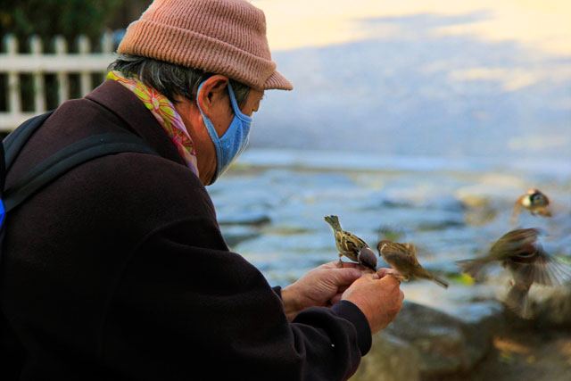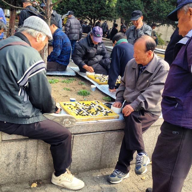 Mais adiante, em outro setor da praça, a cena não era melancólica como a dos pardais sendo alimentados, mas fascinante tanto quanto. Vários idosos se divertiam com o go, um jogo de tabuleiros bastante popular no leste da Ásia.