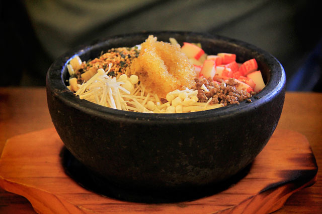 Arroz com kani, gergelim, ovas de peixe, broto de feijão, repolho, carne moída e cogumelo, no Yookssam Naengmyeon