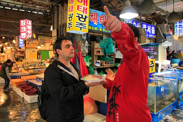 Obviamente, não comi nada. Estava contente só por estar ali. Já o Élcio comprou uma bandeja espetacular de sashimi por digníssimos 20.000 wones. Para comê-la, o peixeiro nos indicou um restaurante situado nas dependências do mercado, onde cada cliente paga 3.000 wones para fazer uso das mesas e talheres e servir-se de alguns molhos e acompanhamentos. Lá, instalamo-nos à moda coreana e meu amigo devorou cada peixe cru de sua recém-adquirida bandeja.