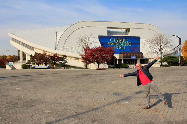 Antes de dar seguimento ao relato daquele dia, preciso contar um detalhe importantíssimo sobre o Parque Olímpico, que descobri somente quando cheguei ao Brasil e que me deixou enfurecido. Sabe o estádio que achei terem demolido? Está de pé, no mesmíssimo lugar. Sabe a piscina que visitei e me emocionei diante da lembrança das competições de saltos ornamentais e de natação? Não era a mesma. Fique muito puto! O fato é que as competições dos jogos de 1988 sediadas em estádios e arenas aconteceram em dois lugares de Seul: no Olympic Park, que foi onde estivemos, e no Seoul Sports Complex, que é o local onde está o Jamsil Olympic Stadium e a piscina tão venerada por mim. Se você é fã de olimpíadas assim como eu e o Élcio, indico as duas visitas. O Ol-Park é certamente mais belo, mas a aura dos jogos paira sobre os dois. Para ir ao Sports Complex, pegue as linhas 9 (ocre) ou 2 (verde) do metrô e desça na estação Sports Complex. Para ir ao Ol-Park, pegue a linha 9 e desça em Olympic Park ou a linha 8 (rosa) e desça em Mongchotoseong.