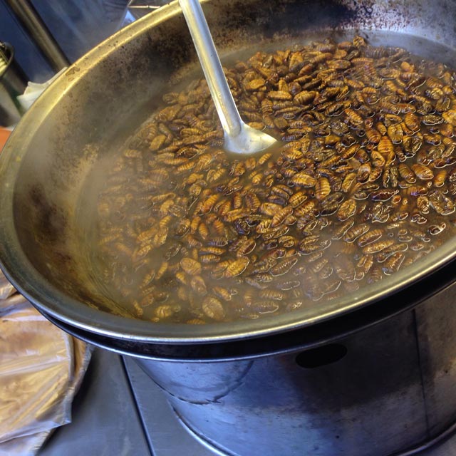 Nossa inesquecível estadia em Seul estava quase no fim. Para encerrar a viagem com chave de ouro, voltamos à Insadong-gil, em Insa-dong. Compramos alguns souvenirs e tomamos chá verde, mas o motivo de nossa terceira visita ao bairro era um desafio. Precisávamos mostrar aos amigos que comeríamos uma porção de pupa de bicho-da-seda. Quando anunciamos no Facebook que em Seul provaríamos o tal beondegi, todos duvidaram. Bem, eu não como nem camarão, mas sou chegado na crocância de um inseto. Nunca havia degustado um, mas, assistindo aos programas de comidas excêntricas da TV a cabo, tinha a impressão de que esses bichinhos eram bem gostosos e salgadinhos.