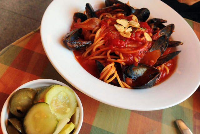 Já era hora de almoçar, e temíamos os preços das refeições servidas nas redondezas. Eu também tinha medo do que comeria, pois TODOS os meus amigos que foram à Coreia reclamaram da culinária local. Faziam careta ao falar da “gororoba”, dizendo terem sido salvos por Ronald McDonald’s. Mas em um determinado ponto da Samcheong-ro, vimos uma placa que anunciava pratos atraentes com um custo reduzido. O restaurante se chamava Goshen. Para se ter uma ideia do valor das refeições, o Élcio pediu um espaguete com molho de tomate e ostra, com direito a sobremesa e café. Isso custou apenas 14.000 wones, que, na época, valiam uns R$ 30. Nada mal para um bairro como o Samcheong-dong, muitas vezes comparado ao Soho de Nova Iorque. Nossas refeições não eram típicas da Coreia, mas estavam deliciosas!