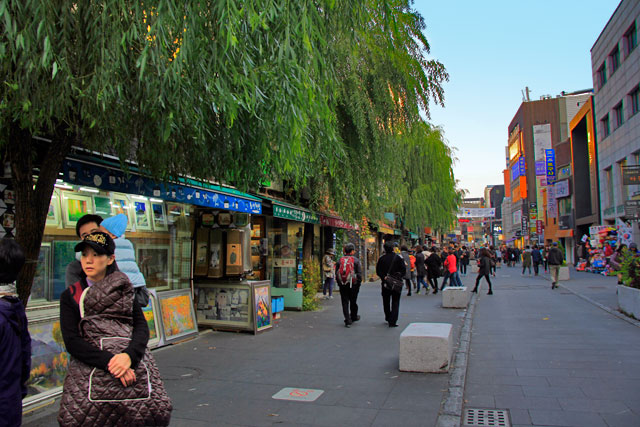 Deixamos o maldito free shopping, pegamos o metrô na estação Euljiro 1-ga e descemos na Anguk para dar outra passeada por Insa-dong. Estivemos ali à noite no nosso primeiro dia em Seul para provar da tradicional e apimentada comida nativa. Mas o bairro oferece muito mais do que refeições picantes. É também conhecido por suas mais de 100 galerias de arte, pelas lojas de artesanato e de cerâmica, pelos antiquários, pelas lojas de artigos de papelaria e pelas famosas casas de chá. Numa mistura de passado com presente, sua cultura erradia cores, delineia formas e exala aromas.