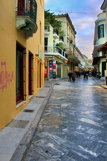 Mas, como eu mesmo disse, na virada do ano, o importante é estarmos de bem com a vida, principalmente se estivermos viajando. Deixamos a Praça Jacqueline de Romilly e seguimos caminhando até o hotel. Ainda chovia, e o chão molhado dava um toque muito especial a Atenas.