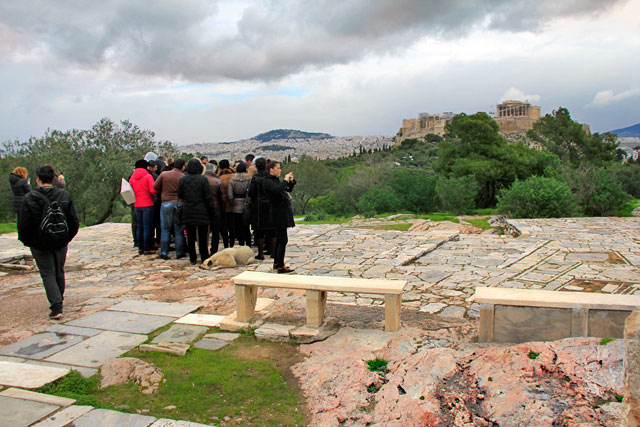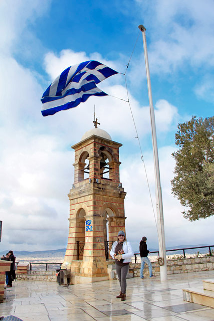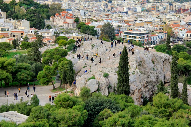 A vista de cima do Areópago é fenomenal, mas, naquele dia, o local encontrava-se extremamente sujo. Havia centenas de garrafas de bebidas e embalagens de salgadinhos espalhadas por todo o canto. Acredito que, à noite, o monte seja um ponto de encontro de baderneiros.