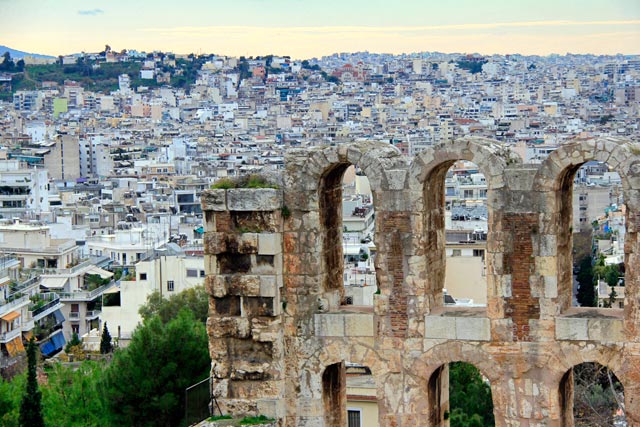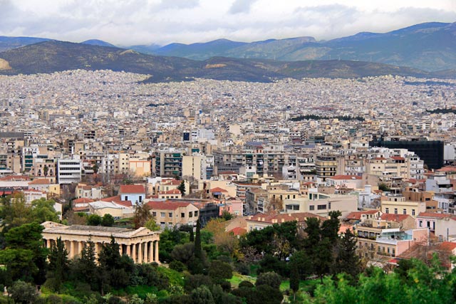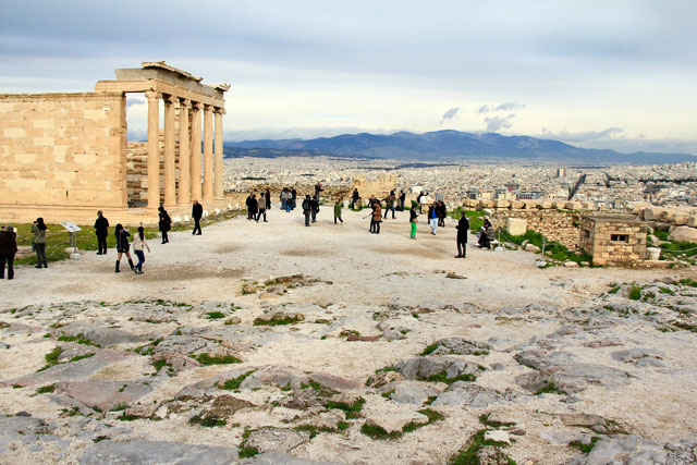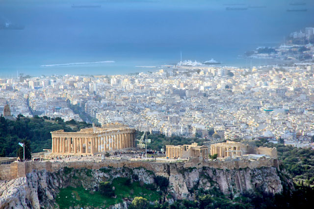 Além dos monumentos, a Acrópole oferece uma vista espetacular da cidade. De lá de cima, é possível ver Atenas de todos os lados, coberta por uma superfície urbana levemente esbranquiçada que culmina num horizonte aparentemente muito distante.