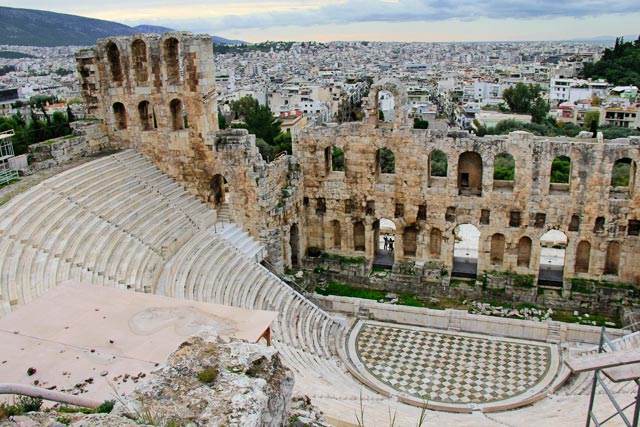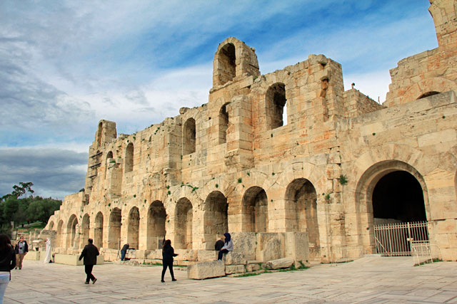 Primeiro, passamos pelo Odeão de Herodes Ático, um teatro construído por volta de 174 pelo político Herodes Ático em memória de sua esposa falecida.