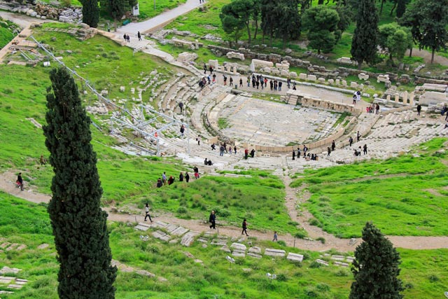 Finalizando o passeio pela colina, visitamos o Teatro de Dionísio, o mais importante dos teatros da Grécia Antiga. Dionísio, que hoje posso considerar minha divindade grega favorita, foi o deus do entusiasmo, da fertilidade e, principalmente, da intoxicação por vinho que funde o beberrão com o ser divino (honrado por mim aquele que eleva recreação, bebidas e insanidade a níveis celestiais). Em homenagem a ele, os gregos faziam grandes festas que acabaram dando origem às Dionísias Urbanas, que, por sua vez, originaram as primeiras manifestações do teatro ocidental. Sendo também lembrado como o deus do teatro, a ele foi dedicado a construção do Teatro de Dionísio, erigido no século V a.C. na porção sul da Acrópole.