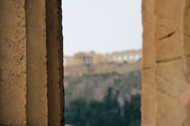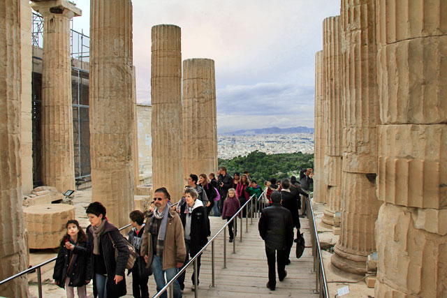 Logo depois, cruzamos o Propileu, um enorme pórtico de entrada da Acrópole, encomendo pelo líder democrático Péricles entre 437 e 432 a.C.