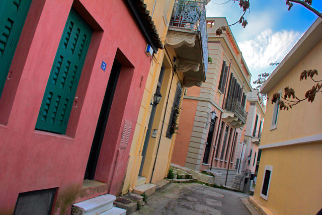 Do arco, retornamos ao pé da Acrópole. Circulamos a colina até o pequeno bairro de Anafiotika. As primeiras casas dessa comunidade foram construídas no século 19, abrigando trabalhadores da Ilha de Anafi que vieram a Atenas para remodelar o palácio do Rei Oto da Grécia. Embora o bairro seja minúsculo, não encontramos suas casas mais características, que possuem o estilo arquitetônico cicládico, lembrando as típicas construções das ilhas gregas. Mas valeu o passeio pelas redondezas.