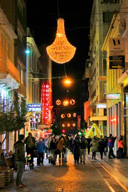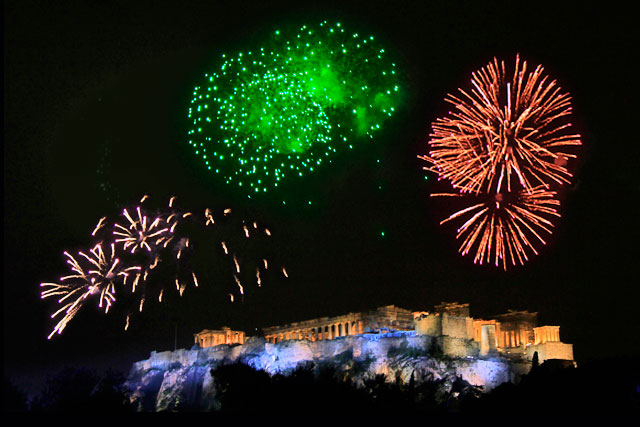 Chegamos à praça por volta das 22h45. Sentamo-nos em um restaurante da Rua Iraklidon para comer, beber e assistir à queima de fogos, que aconteceria na Acrópole, visível dali. Pedimos sanduíches e bebidas. Chuviscava um pouco e o frio castigava mais do que professora de primário na década de 80. Os minutos foram passando, e nada do rango chegar. Eu estava bebendo uma cerveja muito forte, que me deixou pra lá de Bagdá. Eis que, no início da contagem regressiva, o pobre garçom aparece com nossas refeições. Eu disse “Moço, deixa aí na nossa mesa, porque vamos assistir aos fogos!”. Sete segundos depois, “Feliz 2015!”. Nossos olhos brilhavam arregalados em direção à Acrópole.