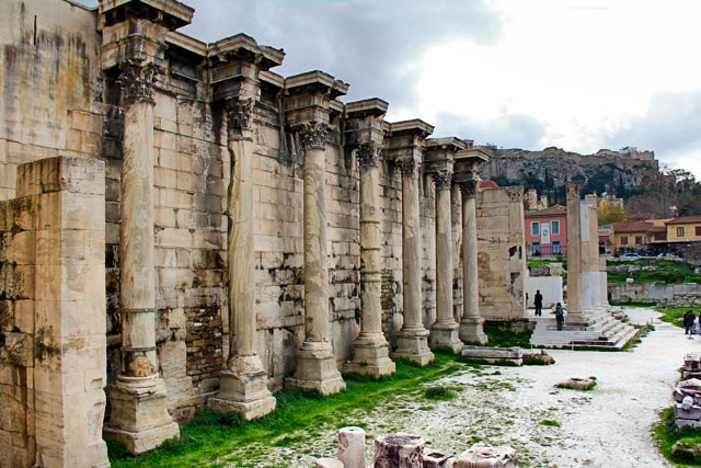 De estômagos satisfeitos, seguimos pela Adrianou em direção às ruínas da Biblioteca de Adriano, edifício construído em 132 por ordem daquele imperador romano para abrigar sua extensa coleção de livros e funcionar como espaço de leitura e centro de convenções. Como a Estoa de Átalo, foi destruída pelos hérulos em 267. Infelizmente, estava fechada. Embora funcione diariamente das 8h às 15h, em alguns dias (os quais não consegui precisar), fecha mais cedo. E aquela terça-feira era um desses dias. Pelo menos pudemos ver parte das ruínas do lado de fora.