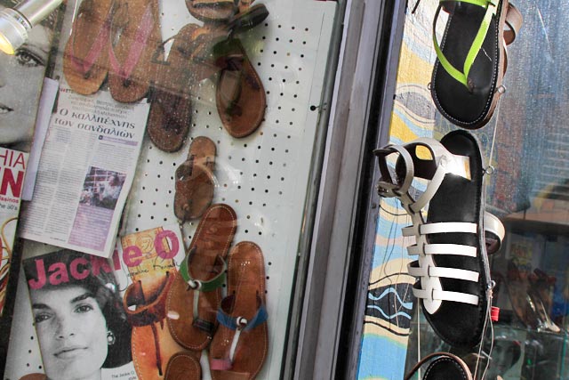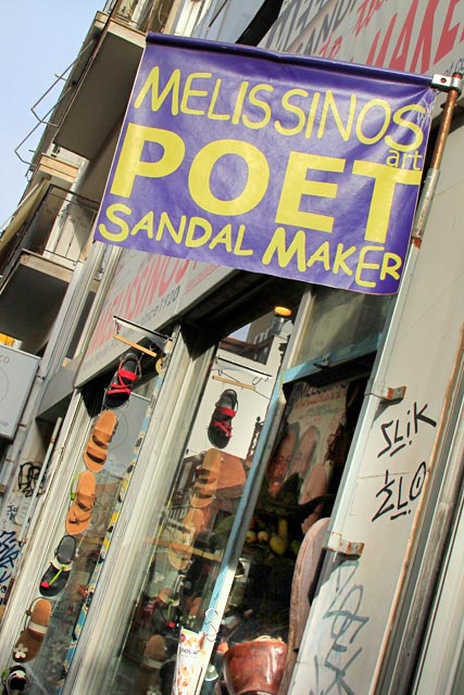Retornando à Monastiraki, passamos na Melissinos Art, a loja do Poeta Sandalheiro, situada na Rua Aghias Theklas, 2, quase esquina com Ermou. O pequeno negócio em família foi fundado por Stavros, um poeta fabricante de sandálias que caiu nas graças de fregueses como os Beatles, Sophia Loren, Jackie Onassis, Barbara Streisand, Maria Callas, Jeremy Irons e tantos outros afamados. Hoje, o próspero negócio é comandado pelo seu filho Pantelis.