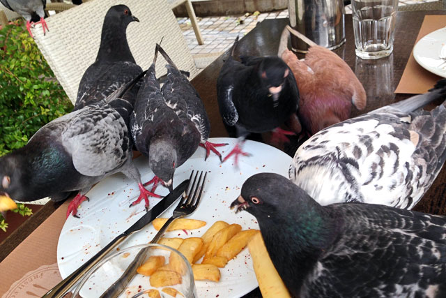 Nosso desapontamento foi esquecido logo que vimos alguns pombos almoçando na mesa de um restaurante, na entrada do museu. Educadamente – à maneira deles –, a moçada de patas vermelhas se deleitava nos restos das batatas fritas deixadas por um cliente. Antes de enrugar seu nariz de nojo, lembre-se que você já fez isso ao menos uma vez na vida. Por que não os pombos?!