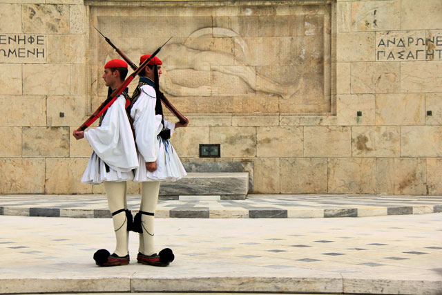 Após uma breve caminhada por Mikolimano, pegamos um táxi e desembarcamos na Praça Sintagma. Por sorte, estava na hora da troca da guarda do parlamento, que acontece todos os dias, de frente para a Tumba do Soldado Desconhecido. Na verdade, a cerimônia completa acontece somente aos domingos, às 11h. Mas aquela pequena demonstração foi suficiente para a plateia se divertir com o uniforme ultrapeculiar dos soldados e suas passadas dramáticas e sincronizadas. Ao final, todos tiveram a oportunidade de fazer uma foto ao lado dos jovens performáticos.