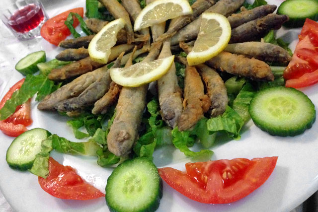 Por módicos 6 €, meu pai e o Élcio devoraram uma bandeja lotada de sardinhas acompanhadas de alface, tomate e pepino. Pedimos também pão na chapa, que, regado com azeite, dava um excelente tira-gosto.
