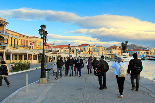 As tavernas têm um formato bem interessante. Ficam de frente para a baía e possuem janelas de fora a fora que funcionam como vitrines para a água. Geralmente, a cozinha situa-se no imóvel do outro lado da rua. Meus companheiros pediram uma combinação que oferecia salada (grega) como entrada, uma porção de camarão, lula e sardinhas como prato principal (meu pai pediu peixe) e uma taça de vinho branco. Essa refeição custou 20 € para cada. Pelo mesmo valor, além da salada, comi um filé acompanhado de arroz e batatas. Não foi uma refeição barata, mas também não foi cara.