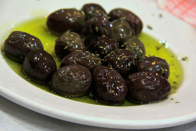 Em Atenas, desembarcamos no ponto da Rua Dionysiou Areopagitou, coincidentemente bem de frente para o To Kati Allo, restaurante em que almoçamos no sábado passado. Zeus não poderia ter nos dado presente melhor! Estávamos sem comer desde o café da manhã. Eram umas 16h, então jamais deixaríamos o singelo e aconchegante estabelecimento passar batido. Entramos, saudamos a dona do restaurante e pedimos tudo o que tínhamos de direito. Como autênticos brasileiros, antes de almoçar, degustamos um belisquete para escancarar o apetite já aberto. Azeitona preta, azeite, ervas e cerveja seriam uma ótima opção para começar a nos despedir da longa jornada pela capital grega. “Sti̱n ygeiá sas!”, brindamos a Atenas.