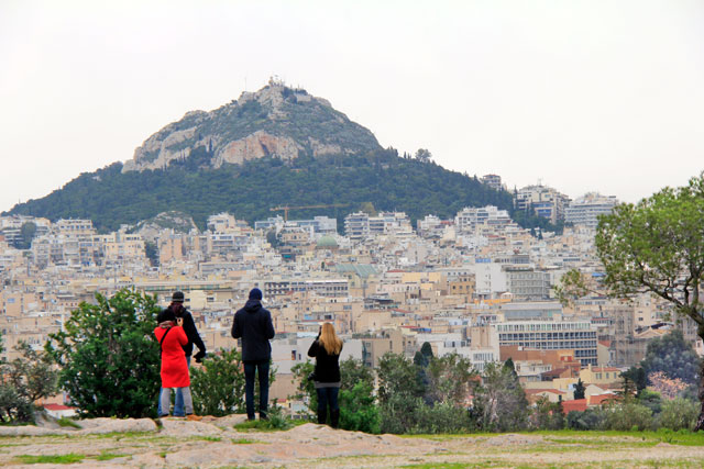 Como em alguns pontos elevados de Atenas, a caminhada pelo monte era ornada com belíssimos panoramas. O tempo estava horrível, mas nada como a Acrópole se destacando no horizonte para disfarçar a insipidez monocromática em que o céu se encontrava.