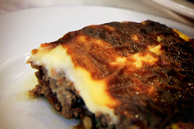 Era hora de almoçar. Ali perto, de frente para o Novo Museu da Acrópole, no número 12 da Rua Hatzichristou, entramos num restaurante bastante modesto, mas que serve refeições da melhor qualidade. Chama-se To Kati Allo. Lá, o cliente escolhe entre uma belíssima variedade de comidas expostas na pequena vitrine do balcão. A dona do estabelecimento, uma genuína senhora grega, monta as refeições e as leva até a mesa. Achamos que ela colocaria um pouco de cada coisa em nossos pratos, mas, na verdade, cada pedido é um prato. Quem pede arroz, frango, salada e batatas, por exemplo, “corre o risco” de receber de três a quatro refeições. Editar é fundamental, mas, diante de tantos aromas, cores e texturas, fica difícil para o comensal decidir qual será seu banquete. Eu pedi a tradicionalíssima moussaka, uma espécie de lasanha feita basicamente de berinjela, carne moída, queijo, batata e tomate. Delicia! A foto abaixo está horrorosa, mas a gororoba estava boa. Já meus companheiros pediram batatas, arroz, cordeiro, frango, pimentões recheados, azeitonas, etc. Pasmem: foram capazes, ainda, de solicitar pães para comer com azeite!
