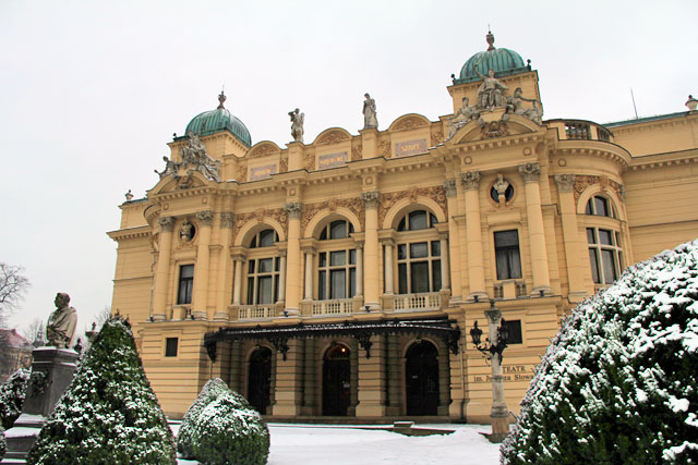 Primeiro, fizemos uma pequena caminhada em um trecho do Parque Planty (Planty Park), que contorna toda a Cidade Velha (Stare Miasto). Em seguida, passamos pelo Teatro Juliusz Słowacki (Teatr im. Juliusza Słowackiego w Krakowie), construído em 1893 no estilo barroco. Belíssimo!