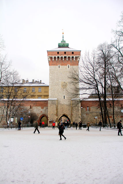 Cruzamos o barbacã e seguimos até o Portão de São Floriano (Brama Floriańska), uma torre de granito vermelho construída no século 14 também como parte das muralhas protetoras de Cracóvia. Dava acesso à Cidade Velha.
